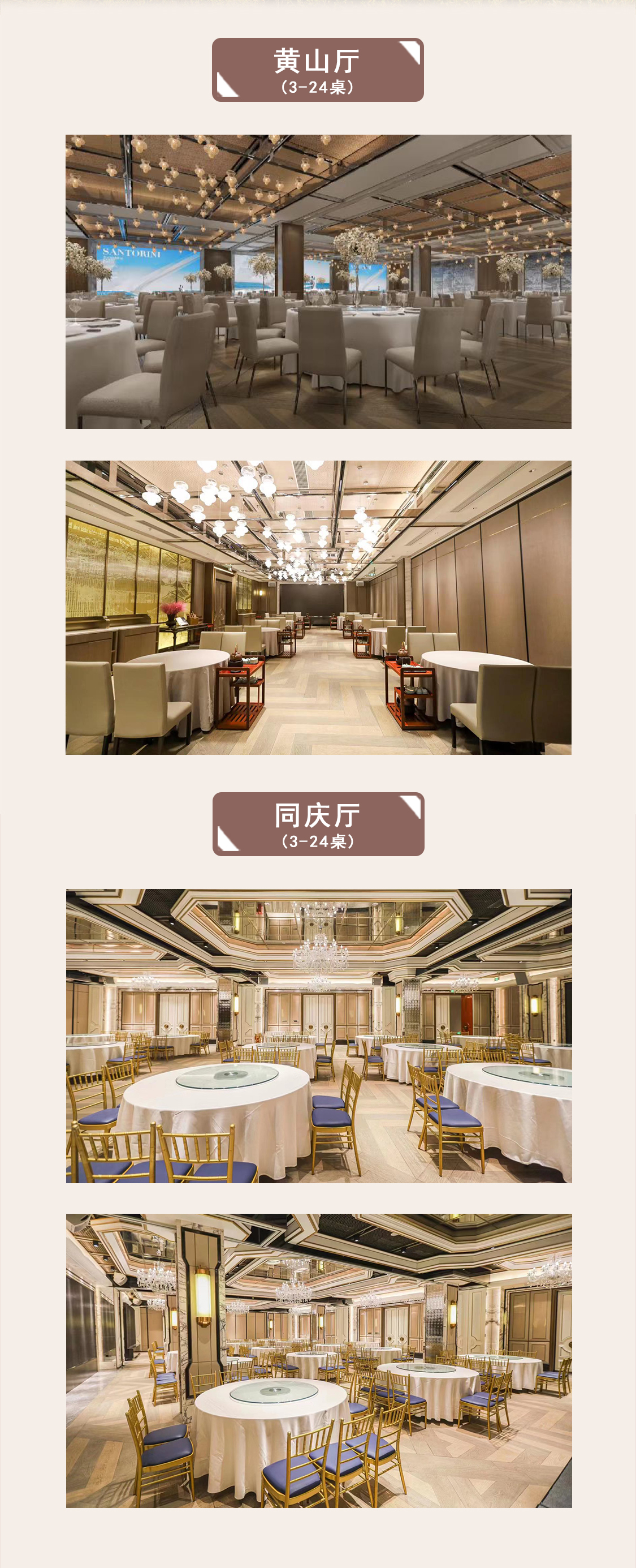 同庆楼滨湖万达店,共拥有两个宴会大厅,黄山厅可接待30桌宴席,同庆厅可容纳22桌,宴会大厅内配有高贵奢华的水晶吊灯,富丽堂皇,高贵典雅。欢迎大家通过婚礼季一站式备婚平台预定同庆楼滨湖万达店,享专属优惠!