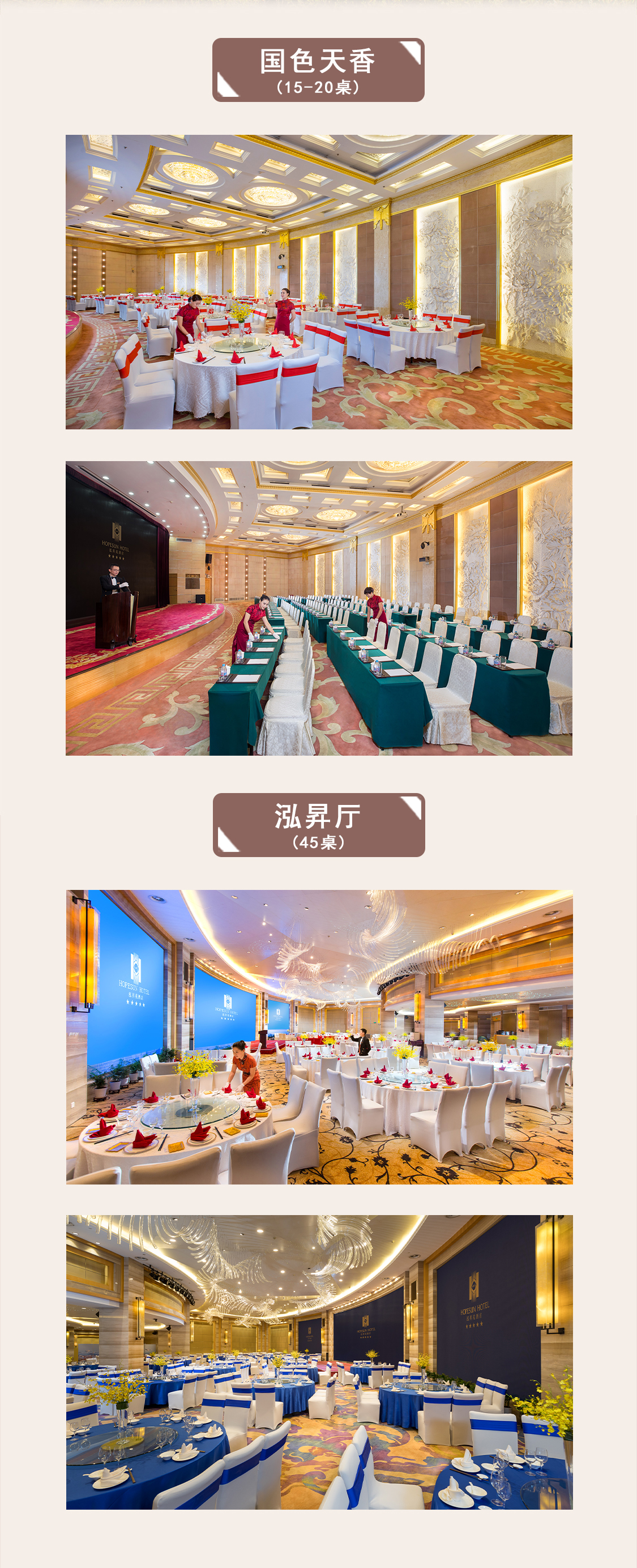 酒店有两个大型宴会厅,泓昇厅最多容纳45桌(共可容纳500人);国色天香最多容纳20桌,另有其他包厢,共可容纳90桌婚宴。 泓昇苑酒店是江阴首家五星星酒店,地理位置优越,走路3分钟可达锡城运河公园。欢迎大家通过婚礼季一站式备婚平台预定泓昇苑酒店,享专属优惠!